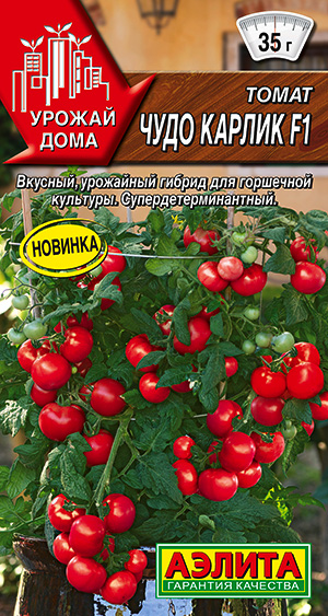 Ультраранний гибрид для украшения солнечного балкона, подоконника или террасы. Высота взрослого куста не превышает 20-25 см. Первый урожай снимают через 85-90 дней после всходов. Растения супердетерминантные, компактные, штамбовые, сильнооблиственные. Плоды собраны в простые кисти по 5-7 шт в каждой. Коренастые кустики буквально усыпаны ярко-красными томатами массой 30-35 г на протяжении всего сезона. Плоды очень сладкие, сочные и ароматные. Томат прекрасно подходит для приготовления свежих салатов и цельноплодного консервирования. Урожайность 1-1,2 кг с одного растения.