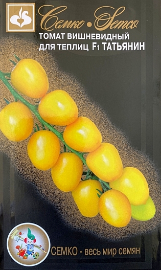 Томат Татьянин F1 - ранний кистевой гибрид для теплиц и открытого грунта, индетерминантный, LSL типа. От всходов до начала плодоношения 80–85 дней. Растение мощное, расстояние между кистями 15-20 см. Соцветие простое , в кисти в среднем 8-10 помидоров. В условиях пониженных температур могут формироваться сложные кисти. Плод томата сердцевидной формы , насыщенного-желтого цвета , очень плотный , массой 25-30 г, устойчив к растрескиванию. Вкус и товарность помидоров отличные. Томат Татьянин F1 устойчив к вирусам томатной мозаики (TоMV), желтого скручивания листьев (TYLCV), вертициллезу (Va, Vd), фузариозу (Fol1–2), кладоспориозу (Ff), и бактериальной пятнистости(Pst). Схема посадки 70х40 см. Урожайность свыше 15 кг/м2. Выращивание в открытом грунте обязательно с подвязкой к опоре.