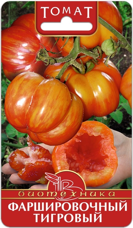 Индетерминантный, высота растения, при выращивании в защищенном грунте, не ограничена. Первая кисть формируется после восьмого листа, каждая последующая через 3-4 листа. Кисть простая, состоящая из 5-7 одинаковых плодов. Форма плода кубовидная, с четко выраженными долями, красного цвета с желто-оранжевыми полосами, массой 120-130 г. Плоды в кисти созревают практически одновременно, что позволяет делать сбор кистями.