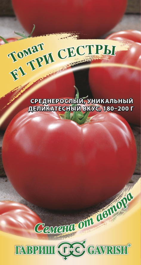 Новый гибрид авторской селекции, заслуживающий пристального внимания из-за своего уникального вкуса. Не секрет, что у самых вкусных томатов в мякоти содержится меньше кислот и больше сахаров, они мясистые, с маленьким количеством семян и нежной кожицей. У F1 Три сестры именно такие деликатесные плоды. Гибрид созревает довольно быстро, и уже через 110-150 дней на столе будут красоваться крупные одинаковые томаты массой 180-200 г. Растения детерминантные (с ограниченным ростом), высотой 120-150 см, для выращивания в открытом грунте (коловая культура) или в теплицах. Использование универсальное — салаты, маринования, засолка.