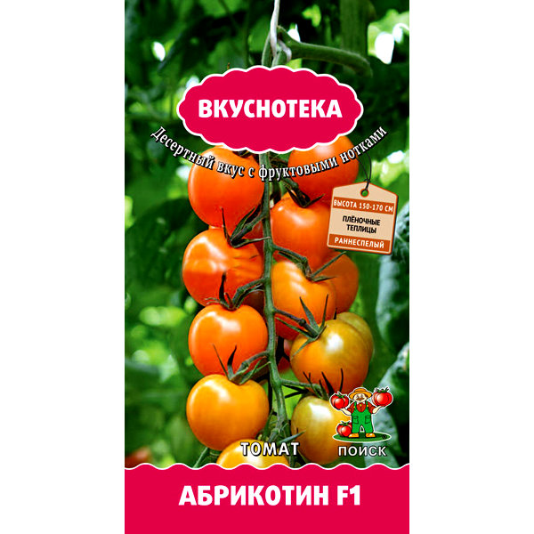 Раннеспелый гибрид для пленочных теплиц. Период от всходов до начала плодоношения 95-100 дней. Растение индетерминантное, высотой 150-170 см, нуждается в подвязке, формировка в 1-2 стебля с удалением пасынков. Обильный, неприхотливый. Плоды округлые, гладкие, блестящие, массой 16-20 г, собраны в красивые компактные кисти по 12-14 штук. Окраска желто-оранжевая (абрикосовая). Вкус кисло-сладкий с фруктовыми нотками. Пригоден для уборки целыми кистями. Устойчив к вирусам, фузариозному увяданию, бурой пятнистости листьев.