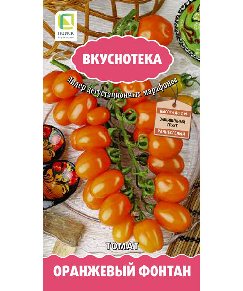 Сладкие черри с фруктовыми нотками. Индетерминантный раннеспелый сорт для выращивания в защищенном грунте, нуждается в подвязке и формировании. От всходов до начала созревания 90-95 дней. Формирует длинные кисти с 14-28 плодами. Плод удлиненно-цилиндрической формы, плотный, ярко-оранжевый, блестящий, массой 15-20 г, с высоким содержанием сухих веществ. Является богатым источником антиоксидантов – ксантофила и каротина, которые помогают сохранить здоровье человека. Великолепен для свежего потребления, в салатах, при декорировании блюд и консервирования.