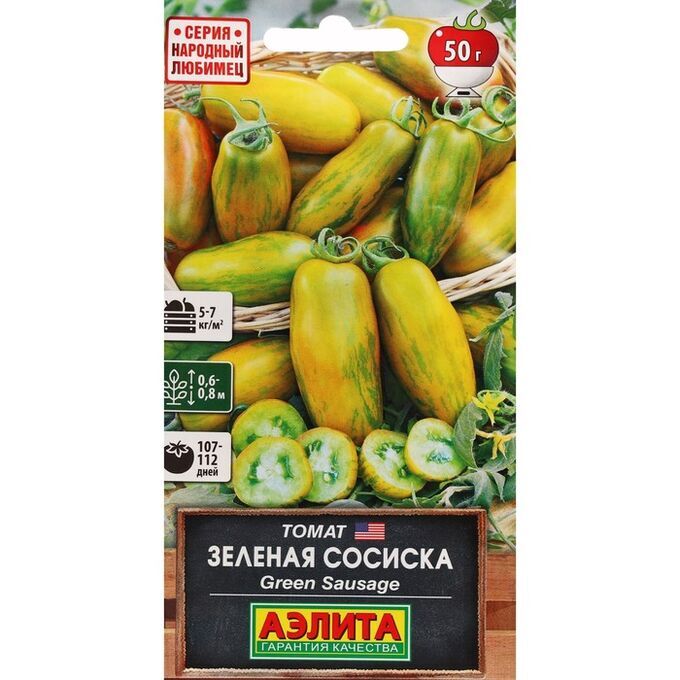 Среднеранний сорт, получивший мировую известность под названием Green Sausage. Создан в США и моментально стал хитом продаж благодаря необыкновенной окраске и форме плодов. Растения детерминантные, выносливые, отлично плодоносят в открытом грунте (высота кустов 60-65 см). В теплице вырастают до 70-80 см. Возможен перевод точки роста на боковой побег. Созревание наступает через 107-112 дней после появления всходов. Томаты* продолговатой формы, средней массой 50 г, при созревании – желтые с зелеными полосками. Мякоть зеленая, плотная, мясистая, сладкая. Урожайность в защищенном грунте 5-7 кг/м2. Сорт салатного назначения, пригоден для заготовок впрок.