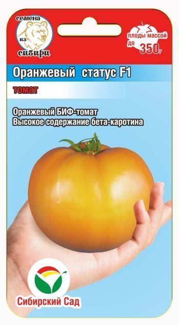 Новый детерминантный раннеспелый гибрид (от всходов до созревания 95-100 дней), с крупными мясистыми плодами насыщенного оранжевого цвета. Рано и часто закладывает цветочные кисти. Первое соцветие закладывается над 5-7 листом, последующие через 1-2 листа. Плоды округло плоские, глянцевые, без зелёного пятна у основания, массой 250-350 гр. Гибрид относится к БИФ томатам, имеет очень плотную малосемянную мякоть отличного вкуса. Плоды устойчивы к растрескиванию, отличаются повышенным содержанием бета-каротина, полезны для диетического питания взрослых и детей. Гибрид устойчив к ряду вирусных и бактериальных заболеваний томатов. Урожайность до 17 кг/кВ.м.