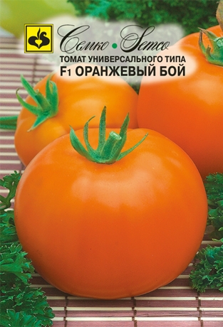 Оранжевый Бой F1 - ранний томат для защищенного грунта. Гибрид полудетерминантный. От всходов до начала созревания 95–100 дней. Растение среднеоблиственное. Первое соцветие формируется над 7–9 листом. Кисть простая с 4–6 плодами. Плоды округлой формы, насыщенно-оранжевой окраски без зеленого пятна у плодоножки, плотные, гладкие, массой 180–220 граммов. Отличается великолепными вкусовыми качествами, высоким содержанием бета-каротина и сухих веществ. Товарность и транспортабельность высокие. Томат для защищенного грунта Оранжевый Бой F1 устойчив к вертициллезному увяданию (Va, Vd), фузариозному увяданию (Fol 1–2) и альтернариозу (Asc). Рекомендуется для выращивания в пленочных теплицах и открытом грунте с подвязкой к опоре. Схема посадки 70х40 см. Урожайность в открытом грунте 10–12 кг/м2, в теплицах свыше 15 кг/м2.