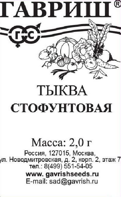 Среднепоздний (112-138 дней от полных всходов до сбора плодов) сорт. Растение длинноплетистое, средней мощности. Длина главного стебля до 7 м. Плоды шаровидные и короткоовальные. Поверхность плода гладкая или слабосегментированная, бугристая. Масса плода 10-20 кг и более. Окраска поверхности розовая, желтая, оранжевая и серая. Кора тонкая, гибкая. Мякоть кремовая и желтая, рыхлая, толщиной 4-5 см. Вкусовые качества хорошие. Выращивается рассадным способом и прямым посевом в грунт. Посев на рассаду в апреле, высадка в грунт в мае – июне по схеме 60 x 60 см. Посев непосредственно в грунт в конце мая – июне. Хорошо отзывается на внесение органических удобрений. Урожайность до 15,0 кг/м2.