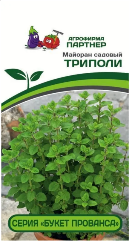 Майоран - многолетняя очень популярная пряно-ароматическая культура. Подходит для открытого и защищенного грунта, а также для контейнерного выращивания, в том числе в светокультуре. Сорт Триполи обладает специфическим вкусом и ароматом, отдаленно напоминающим тимьян, но более тонким и сладковатым. Растение высотой до 30 см, хорошо облиственное. В кулинарии используются листья и молодые побеги в свежем и сушеном виде. Незаменимая приправа для приготовления свежих салатов, супов, мясных и рыбных блюд, при засолке и мариновании, для ароматизации напитков. Зелень майорана улучшает пищеварение, оказывает успокаивающее и мочегонное действие.