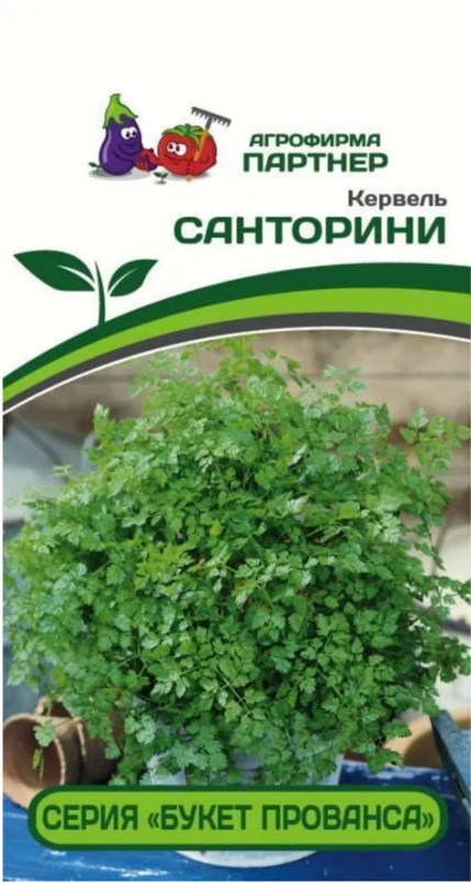 Кервель Санторини - среднеранний сорт, от посева до срезки товарной зелени проходит 30-35 дней, подходит для открытого и защищенного грунта, а также для контейнерного выращивания, в том числе в светокультуре. Растение красивое, компактное, высотой около 50 см, с нарядными перисто-рассечёнными кружевными листьями, обладающими нежным ароматом, напоминающим смесь аниса и петрушки. Свежие листья до начала цветения растения широко используют в кулинарии и народной медицине для лечения ЖКТ. Они богаты эфирными маслами, витаминами А и С, каротином, рутином. В кулинарии употребляют как приправу к мясным и рыбным блюдам, для приготовления салатов, при консервировании и засолке. Именно кервель с тонким травянисто-анисовым ароматом как нельзя лучше подходит к жареным на гриле мясным деликатесам, блюдам из рыбы, закускам из яиц.