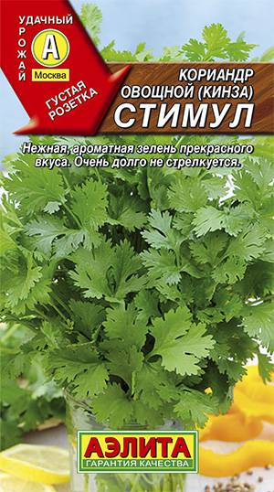 Известный среднепоздний сорт кинзы с компактной розеткой. Устойчив к преждевременному стрелкованию. Период хозяйственной годности зелени длительный, на 12-15 дней дольше, чем у других сортов. Розетка густооблиственная, высотой 25-30 см. Количество листьев в розетке от 12 до 27 шт. Листья темно-зеленые, глянцевые, очень ароматные и вкусные. Масса одного растения в фазу технической спелости на зелень составляет 20-40 г. Сорт высокопродуктивный – урожайность зеленой массы достигает 2,5 кг/м2.
