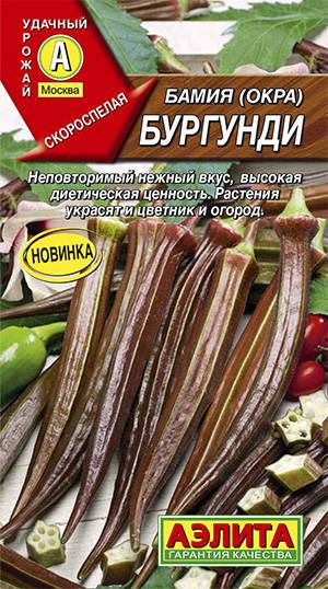 Набирающая популярность однолетняя овощная культура. Растет быстро, начинает плодоносить уже на 55-65 день после всходов и продолжает отдавать урожай до первых заморозков. Растения мощные, экзотического вида, в средней полосе вырастают до 120-150 см, в южных регионах – до 200 см. В пищу употребляют молодые 3-6 дневные завязи (коробочки) массой по 10-30 г. Вкус у плодов необычный, чем-то напоминает баклажан и спаржу, но более нежный и пикантный. Их используют в свежем виде в салатах, для приготовления супов и гарниров. Плоды бамии низкокалорийные и очень рекомендуются в диетическом питании. В средней полосе рекомендуется выращивать под пленкой, в южных регионах – в открытом грунте. Растение нуждается в пасынковании. Завязи срезают или выламывают регулярно, каждые 3-4 дня. При запаздывании со сбором коробочки грубеют и становятся несъедобными.