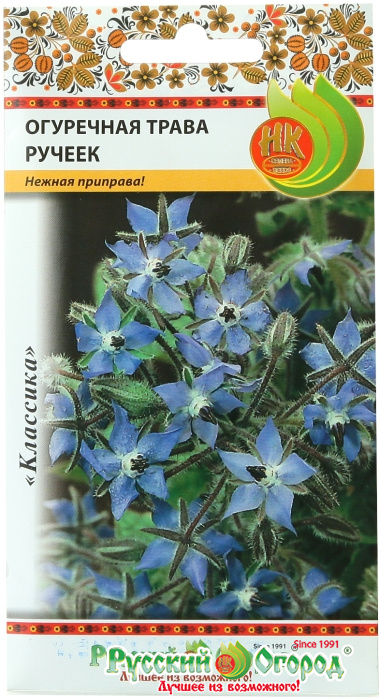 Однолетнее растение с приятным запахом свежего огурца. Период от полных всходов до уборки на зелень 40-50 дней. Рекомендуется для использования молодых побегов, листьев и цветков в свежем и сушеном виде в качестве приправы к овощным блюдам, при консервировании и засолке. Содержит большое количество полезных веществ. Растение раскидистое с интенсивным ветвлением. Розетка листьев горизонтальная, диаметром 20 см, высотой до 40 см. Лист среднего размера, сидячий, темно-зеленый, со слабым восковым налетом, продолговатой формы, слабоморщинистый. Цветок голубой. Молодые листья с мягким опушением. Масса одного растения 100 г. Урожайность зеленой массы 1 кг/кв.м.