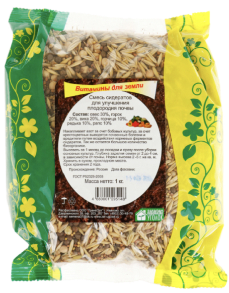 Состав: овес 30%, горох 20%, вика 20%, горчица 10%, редька масличная 10%, рапс 10%
