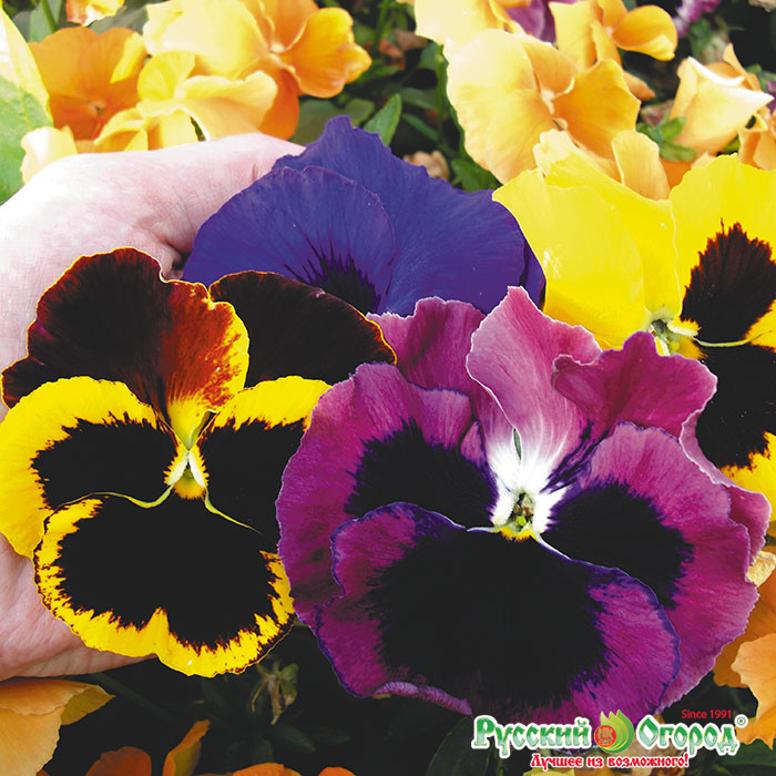 Гибридная однолетняя фиалка, превосходное декоративное растение, подходящее для самых разнообразных цветников/вазонов/контейнеров. Её одинаково успешно можно выращивать, как в открытом грунте, так и в закрытом, а также в обыкновенных цветочных горшках. Главным достоинством Виолы F2 Русский Размер являются, безусловно, крупные цветки с сочной окраской. Настоящий летний фейерверк радости и хорошего настроения, от которого ни на минуту не захочется заскучать! Некоторые цветы достигают 9 сантиметров в диаметре, а некоторые - и того более! Издалека кажется, будто они «смотрят» на прохожих своими яркими «глазками».