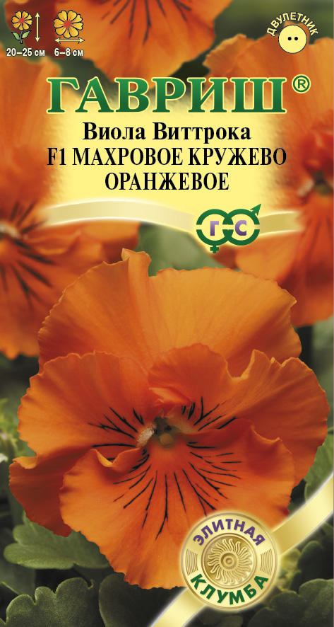 Двулетнее популярное растение из семейства Фиалковые высотой 20-25 см. Цветки оранжевого цвета с черными штрихами в центре, диаметром 6-8 см. Лепестки с фантастической гофрировкой, украшены рюшами. Степень выраженности бахромчатости лепестков зависит от температуры, она увеличивается в прохладных условиях. Ровный габитус, улучшенная форма растений, раннее и обильное цветение позволяют широко использовать эту виолу в профессиональном плане. Цветет обильно и продолжительно с мая по сентябрь. Используют для посадки массивами, на клумбы, рабатки, в балконные ящики и садовые вазы.