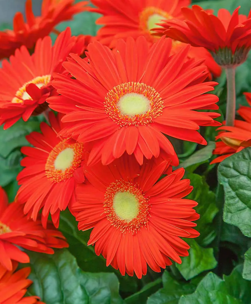 Оранжевая революция очень крупных ромашковидных соцветий до 12 см в диаметре. Самая выровненная по однородности цветения и размеру цветка серия гербер. Растения мощные, кустистые. Прекрасно себя чувствует на недостаточно освещённом окне. Подходит для выращивания и на дачных участках.