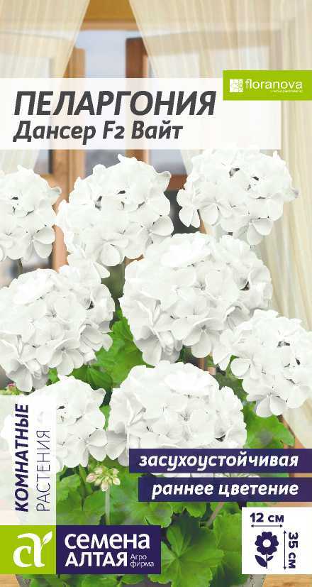 Бюджетная гибридная пеларгония второго поколения. Формирует компактные выравненные кустики с обильной листвой и прочными стеблями. Цветение раннее и обильное, простые крупные цветки собраны в пышные шапки белоснежных соцветий. Используются в озеленении лоджий, веранд, балконов, а также для создания ярких цветочных композиций в саду. В комнатных условиях выращивается как многолетник, в саду – в качестве однолетнего растения.