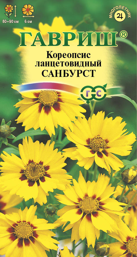 Красивоцветущее многолетнее травянистое растение высотой до 90 см. Стебли прямостоячие, ветвистые. Листья расположены супротивно, пальчато-раздельные или перисто-рассеченные. Цветки махровые и полумахровые около 6 см в диаметре. Кореопсисы - благодарные, обильно и продолжительно цветущие растения. Используютcя для посадки сборных цветников, группами на газонах, в качестве фоновых растений, с южной стороны оград и древесно-кустарниковых насаждений. Они к тому же очень хороши для срезки, в воде цветы стоят дольше недели.
