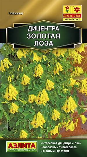 Неповторимая, редчайшая лианообразная дицентра с желтыми цветками. Хорошо разветвленные побеги длиной до 250 см усыпаны гроздями цветов Ø2-3 см с июня до заморозков. Предпочитает легкие, питательные, увлажненные (но без застоя воды) почвы. Хорошо развивается на солнце или в легкой полутени. Побегам требуется опора (решетка, сетка или ширма). В Средней полосе желательно укрытие растений на зиму. Зацветает на второй год. На третий год дицентра ЗОЛОТАЯ ЛОЗА станет лучшим украшением любого сада.