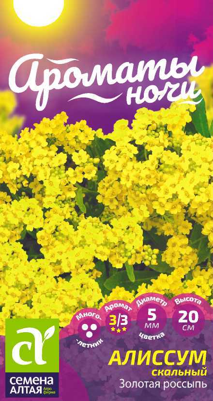 Яркоцветущий ковровый многолетник высотой до 20 см, замечательное украшение каменистого сада и бордюрных посадок. Растение формирует множество побегов, одревесневающих в нижней части, быстро разрастается и покрывает посадки ярким ковром. На фоне серовато-зеленых листьев контрастно смотрятся компактные золотисто-желтые кисти соцветий, состоящие из мелких душистых цветков. Зацветает алиссум на второй год после посадки. Широко используется для посадок в цветники, рабатки, на альпийские горки.