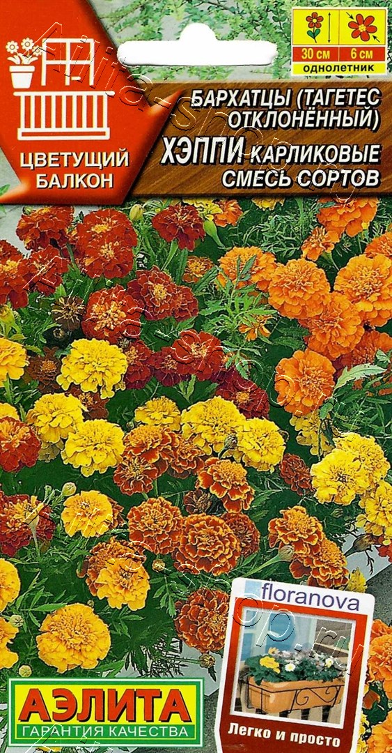 Красочная смесь карликовых бархатцев «Хэппи» (Happy) от английской компании Floranova – это прекрасный выбор для украшения балконов, лоджий и террас. В горшечной культуре растения формируют выровненные и густые кустики высотой и шириной около 20-30 см. Цветение раннее, очень длительное, даже в жарких условиях. Соцветия пышные и крупные, Ø 5-6 см, не выгорают на летнем солнце. Смесь отличается многообразием окрасок, высокой декоративностью на протяжении сезона и неприхотливостью в уходе.