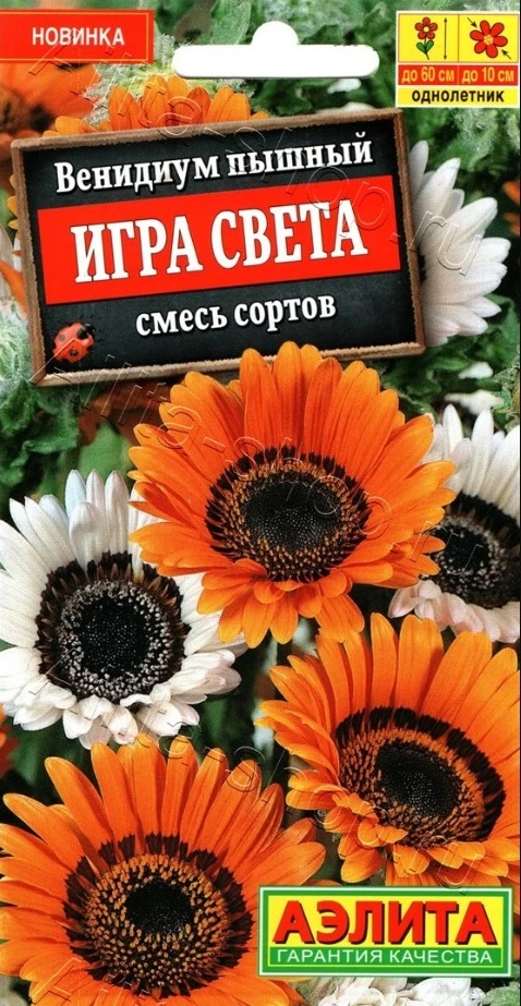 Смесь белоснежных и мандариновых цветков редкого растения из Южной Африки. Венидиум – очень красивый однолетник высотой до 60 см, с густой листвой и крупны ми цветками, похожими на ромашки, до 10 см. Цветет очень ярко и обильно июня по октябрь. Растение отлично подходит для цветников, альпийских горок, вазонов и на срезку.