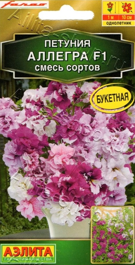 Гибриды «Allegra» – результат многолетней кропотливой работы селекционеров компании Farao (Италия). В смесь входят различные окраски махровых и полумахровых букетных петуний. Это уникальная крупноцветковая серия, используемая для срезки, которая выращивается из семян. Растения образуют мощные побеги до 1 м в высоту*, с большим количеством пышных цветков диаметром до 10 см. Для формирования красивых кустов с прямыми и ровными стеблями необходимы кольцевые опоры.