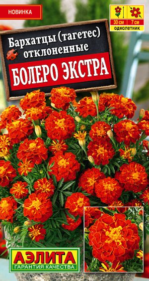 Бархатцы «Болеро Экстра» – яркие огоньки, которые оживят сад и сделают нескучной любую клумбу. Миниатюрные, компактные кустики (высотой 20-30 см) в период цветения сплошь покрываются махровыми соцветиями (диаметр 5-7 см). Окраска цветков очень необычная – красно-коричневая с небольшими вкраплениями золотисто-желтого. Растения очень неприхотливые, отличаются обильным и продолжительным цветением, оказывают санитарное воздействие на почву. Сорт великолепно подходит для оформления бордюров, клумб и для посадок в вазоны и балконные ящики.