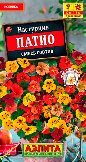 Сочетание всего многообразия оттенков настурции в одной смеси компактных сортов для украшения сада и балкона. Кустики высотой 25-30 см, имеют большое количество изящных, боковых побегов. Цветки диаметром 4-5 см пышным облаком покрывают зеленый полог нежных листьев. Цветение длится до наступления устойчивых заморозков. Яркие, нежные цветки и сочные листья настурции – съедобные, обладают целебными свойствами, освежающим вкусом и пряным ароматом.