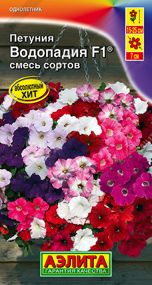 Абсолютный хит! Серия многоцветковых петуний каскадного типа, которая отличается совершенно новой полуампельной формой. Уникальность этих гибридов в том, что новые цветоносные побеги образуются без прищипки в пазухах листьев в середине куста, не оставляя пустот. Растения формируют пышные кустики, высотой 15-25 см. Поникающие побеги длиной до 70 см полностью усыпаны яркими насыщенными цветками диаметром 7 см и спускаются восхитительным водопадом. Гибриды устойчивы к повышенным температурам и неблагоприятным погодным условиям. Петунии Водопадия F1® наилучшим образом подходят для подвесных кашпо и корзин.