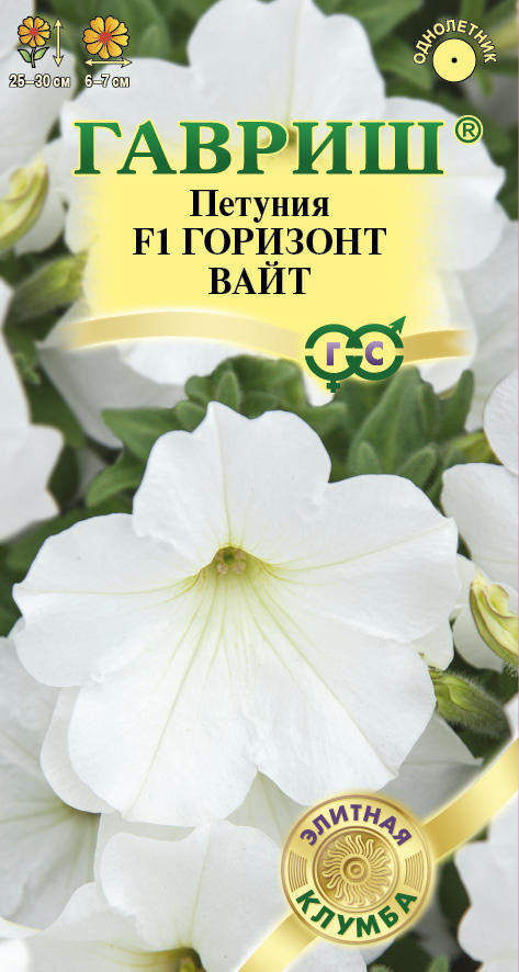 «Горизонт» одна из самых рано и обильно цветущих серий. Благодаря плотным лепесткам, цветки не повреждаются дождями и ветром и растения выглядят опрятно на протяжении всего лета. Формирует компактный куст высотой 25-30 см и диаметром 30-35 см. Цветки белые, диаметром 6-7 см. Украсит клумбы, вазоны, балконные ящики, подоконники, низкорослые бордюры. Рекомендуется для профессионального озеленения и выращивания на продажу.