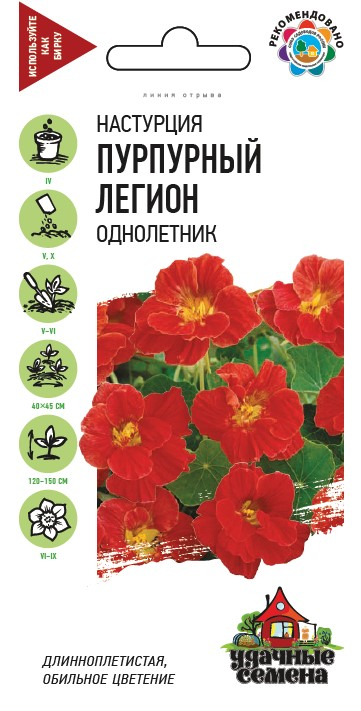 Однолетнее травянистое растение семейства Настурциевые с плетистыми побегами длиной до 120-150 см. Цветет обильно с июня до заморозков. Цветки пурпурно-красные, махровые, 5-6 см в диаметре. Используется для вертикального озеленения, как почвопокровное и как ампельное растение.