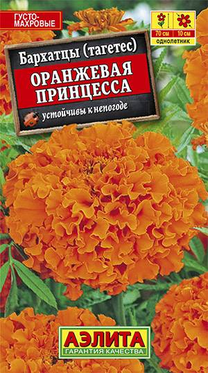Высокорослые бархатцы с очень крупными (Ø9-10 см) густо махровыми соцветиями-корзинками. Растения крепкие, раскидистые, высотой до 70 см, с множеством прочных цветоносов. Благодаря устойчивости к непогоде, кусты прекрасно держат форму и не теряют своей декоративности под воздействием ветра и дождя. Цветение раннее, обильное и продолжительное, с июня до заморозков. Бархатцы Оранжевая принцесса засухоустойчивые, тепло- и светолюбивые. Используются для украшения клумб, цветников, подходят для срезки.