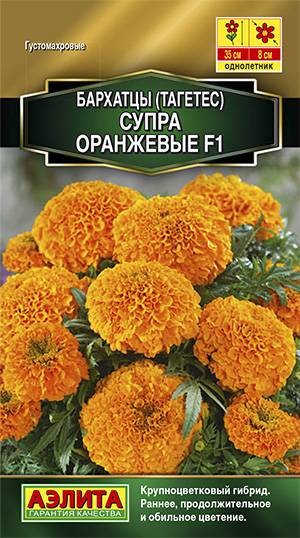 Гибрид бархатцев из серии СУПРА F1 с улучшенными  декоративными качествами. Цветение очень раннее и обильное, продолжается с начала лета до первых заморозков. Соцветия густомахровые, крупные (Ø7-9 см), отлично переносят воздействие дождя и ветра сохраняя форму и цвет. Кустики пышные, сильноветвистые, высотой 30-35 см, с большим количеством цветоносов, отличаются выравненностью и компактностью. Растения холодостойкие, неприхотливые к почвам. Великолепно подходят для выращивания в горшках и балконных ящиках, на клумбах, в бордюрах и цветниках.