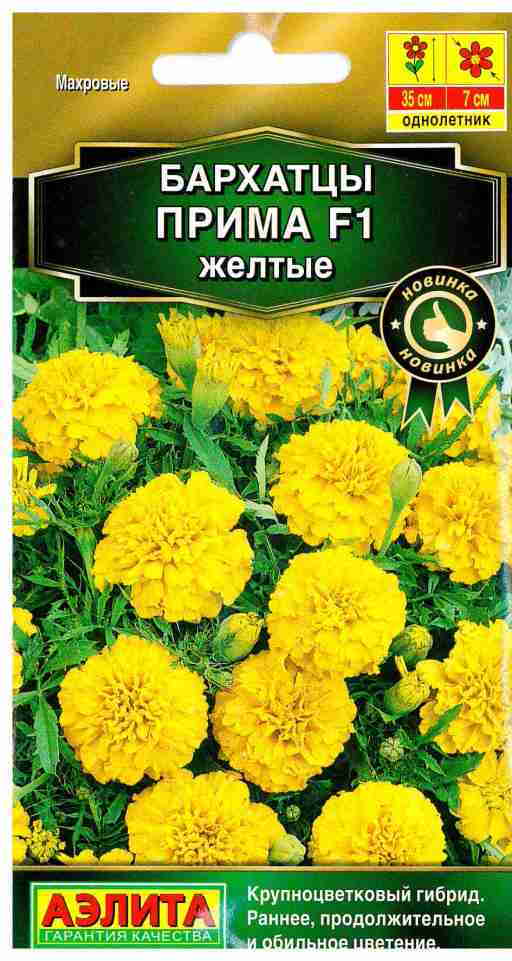 Совершенно новый на нашем рынке гибрид бархатцев из серии ПРИМА F1. Соцветия крупные, Ø6-8 см, 100% махровые. Цветение очень раннее и обильное, с самого начала сезона и до его окончания. Кустики выравненные, до 35 см в высоту, не вытягиваются, остаются плотными и компактными на весь период цветения. Гибрид более устойчив к воздействию дождя и ветра чем обычные сорта, не теряет своей декоративности при длительной сырой погоде. Растения холодостойкие, неприхотливые к почвам, отлично растут в контейнерах, в цветниках и на клумбах. Выращивают рассадным способом.