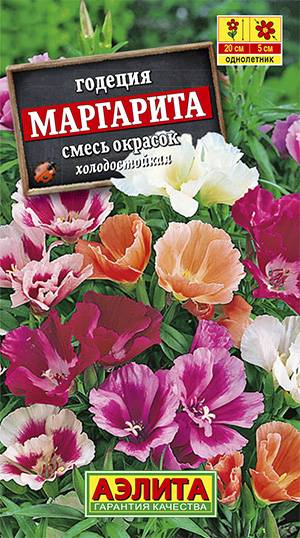 Компактная годеция высотой до 30 см. Кустики прямостоячие, ветвистые, быстрорастущие. Крупные цветки диаметром 5-6 см с шелковистыми лепестками собраны в плотные облиственные кисти. Цветение раннее, обильное и очень продолжительное. Первые заморозки растениям не страшны, т. к. они выносливы и холодостойки. Разно цветная смесь широко используется для посадок на клумбах, в рабатках и бордюрах. Ввиду компактности куста растения идеально подходят для выращивания в уличных вазах, балконных ящиках, горшках.