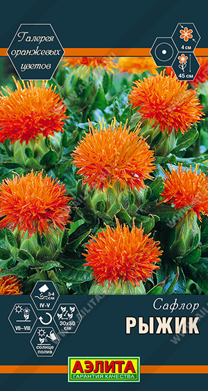 Привлекающий внимание, эффектный однолетник. Помимо его неоспоримых декоративных качеств, сафлор знаменит как масличное и медоносное растение. Высота* куста около 40-45 см, шипы редкие. Пышные апельсиновые цветки ? 4 см красиво контрастируют с изумрудными листьями. Они содержат пигмент картамин – известный желтый краситель для пищевых продуктов и тканей. Из семян выделяют масло, обладающие целебными и косметическими свойствами. Сорт используется в свежем букете, подходит для цветников и бордюров. Растительные остатки применяются в качестве сидеральной культуры.