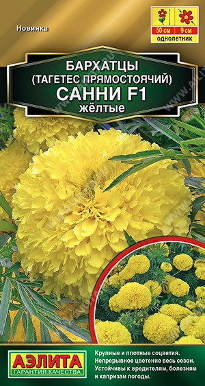 Гибрид с превосходными декоративными качествами. Махровые, по-настоящему крупные цветки достигают 8-9 см в диаметре. Бархатцы Санни F1 отличаются устойчивостью к болезням и вредителям. Серия ценится за простоту в уходе и непрерывное цветение на протяжении всего сезона. Растения среднерослые, высота* крепких, прямостоячих побегов до 40-50 см. Боковые стебли обеспечивают компактным кустикам аккуратную форму. Соцветия плотные, после дождя и полива влага не скапливается в основании лепестков. Цветки долго сохраняют яркость, свежесть и опрятный вид. Серия рекомендована для украшения клумб, бордюров, вазонов и букетов.