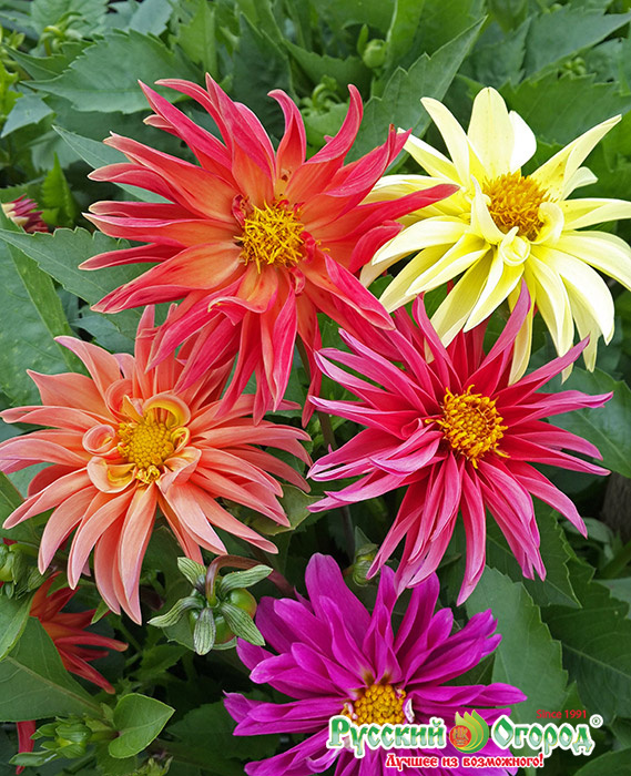 Георгины Кактус Микс вырастают до 120 см высотой, а диаметр их соцветий – около 15 см. Цветение начинается во второй половине лета, вплоть до заморозков.