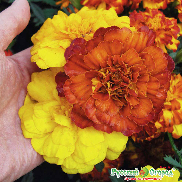Самые крупные цветки среди отклоненных бархатцев! Раскидистые кусты сплошь усыпаны огромными цветками. Устойчивы к жаре и к дождю.