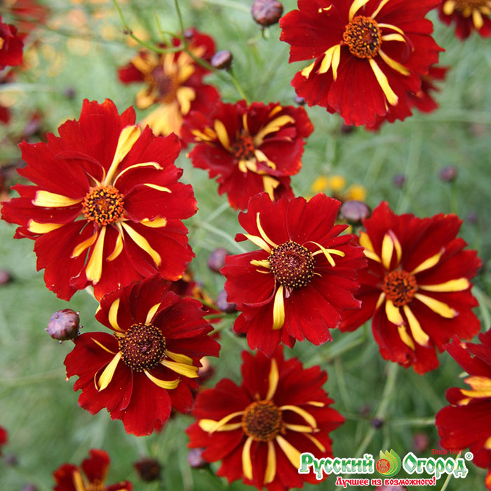 Кореопсис Рулетте – сорт, удивляющий всех садоводов! Он очень красиво смотрится рядом с красным гравилатом или ярко-жёлтыми цветами других растений. А всё из-за того, что его лепестки имеют насыщенный алый оттенок, над которым идёт прореженный ряд жёлтых более узких лепестков. Таким образом, мы получаем удивительный нарядный сорт, который может разрастаться даже самостоятельно, без дополнительных растений вокруг. Кореопсис Рулетте отлично смотрится в миксбордере красно-белых тонов! Высаженные рядом рудбекии, эхинацеи, жёлтые астры или гайлардии с ним прекрасно сочетаются. Также подходят крупные белые ромашки, сальвии и циннии.