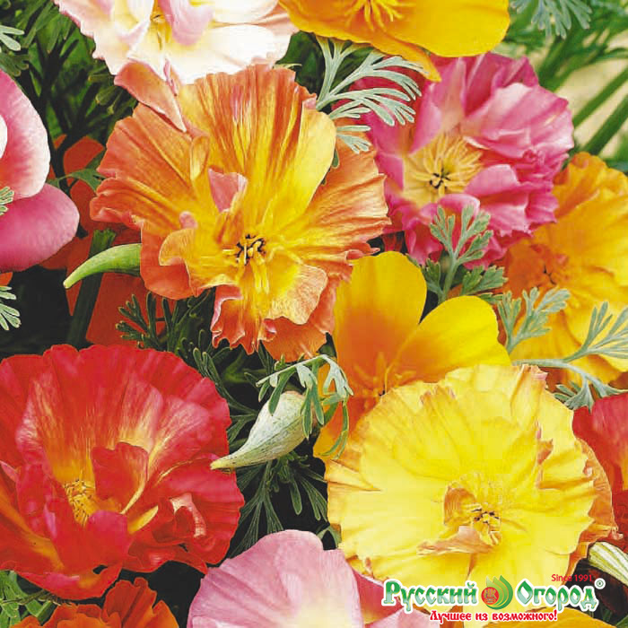 Эшшольция Шифон – смесь из разновысотных растений, их средняя высота 35 см – 40 см. Цветы все пышные, лепестки немного гофрированные по краям. Окраска их различна: жёлтые, насыщенно-розовые, красные, белые. При этом в основном в каждом цветке сочетается сразу несколько оттенков. За это смесь Шифон часто высаживают сольно, ведь такое цветовое раздолье может в один миг сделать клумбы красивее и интереснее. При этом всходы появляются дружно, а цветут с мая и до самых заморозков.