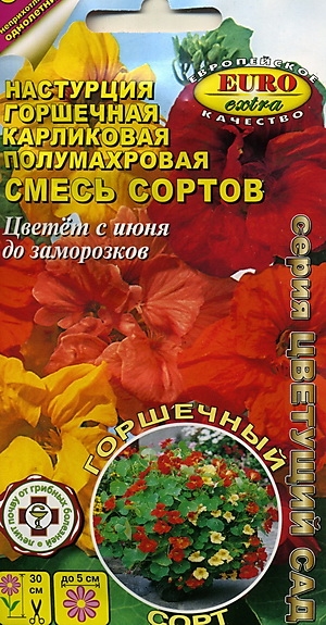 Неприхотливость и яркие краски сделали это однолетнее растение невероятно популярным. Сорт формирует компактные кустики высотой 30 см. Цветки махровые и полумахровые диаметром 5 см, с нежным ароматом, ярких, насыщенных тонов. В отличие от обычных сортов, цветки располагаются выше листвы и направлены вверх, а не в бок. Цветение обильное с июня до заморозков. В садовых цветниках красиво выглядит в бордюрах. Используют для украшения рабаток, рокариев и на альпийских горкок, высаживают в вазоны и висячие корзины на балконах, террасах, в патио. Свежие зеленые семена употребляют в пищу и маринуют. Цветы и листья используют в пищу (в салатах и для украшения сладких блюд). По вкусу настурция напоминает кресс-салат.