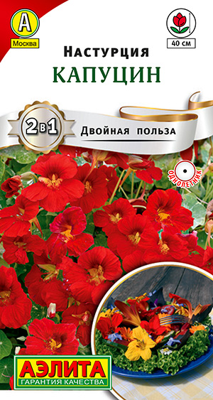 Кустовая настурция с мраморными листьями и крупными малиновыми цветками диаметром 5 см. Растения однолетние, высотой не более 40 см. Быстро развиваются, формируя аккуратный кустик, пышно украшенный яркими съедобными цветками. Сорт подойдет для оформления разнообразных садовых клумб и вазонов. Неприхотливый и устойчивый к болезням культуры – подарок садоводу! Высаженный вдоль грядок в огороде защитит от тли, белокрылки и белянки. Нежные цветки – необычный ингредиент в кулинарии, служат для украшения блюд.