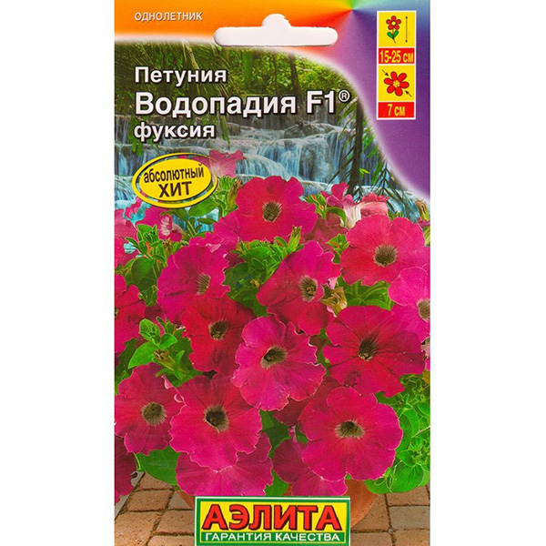 Абсолютный хит! Серия многоцветковых петуний каскадного типа, которая отличается совершенно новой полуампельной формой. Уникальность этих гибридов в том, что новые цветоносные побеги образуются без прищипки в пазухах листьев в середине куста, не оставляя пустот. Растения формируют пышные кустики, высотой 15-25 см. Поникающие побеги длиной до 70 см полностью усыпаны яркими насыщенными цветками диаметром 7 см и спускаются восхитительным водопадом. Гибриды устойчивы к повышенным температурам и неблагоприятным погодным условиям. Петунии Водопадия F1® наилучшим образом подходят для подвесных кашпо и корзин.