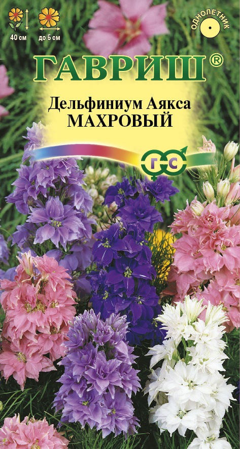 Однолетнее растение с прямым малоразветвленным стеблем высотой до 40 см. Листья сильно рассеченные на узкие доли, на коротких черешках или почти сидячие. Цветки крупные, до 5 см в диаметре, махровые. Окраска цветков белая, розовая, красная, голубая, синяя, сиреневая, фиолетовая. Цветение продолжительное, с июня до осени. Дельфиниум аяксовый — одно из самых легких в выращивании растений, которое сеют непосредственно на постоянное место, так как всходы не выносят пересадки.