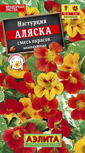 Эффектная кустовая настурция с декоративной, мраморной листвой. Кусты компактные, высотой 30-40 см. Растут и развиваются быстро. Цветки простые со шпорцем, диаметром 4-6 см. Цветение раннее и продолжительное, вплоть до заморозков. Привлекательная смесь настурции украсит рабатки, миксбордеры, станет неповторимой бордюрной культурой. Идеально подойдет для выращивания в садовых вазонах и балконных контейнерах.