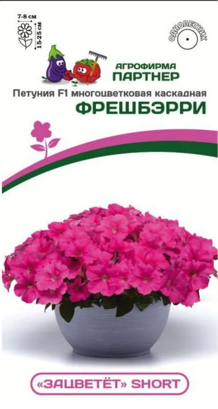 ЗАЦВЕТЁТ Short - невероятная каскадная петуния, настоящий цветочный шар! Прекрасный выбор для кашпо и вазонов, хорошо смотрится в единичных и групповых посадках в грунте. Крепкие растения отлично ветвятся, самостоятельно, без формирующей обрезки, наращивают компактный куполообразный куст диаметром 60 см, который не теряет своей декоративности в течении всего сезона. Благодаря коротким междоузлиям растение формирует так много цветов, что они полностью закрывают собою зелень.