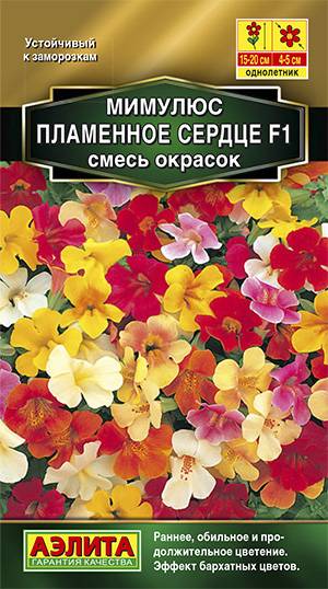 Гетерозисный гибрид с обильным цветением от компании Floranova (Англия). Кустики компактные, сильноветвистые от основания, высотой до 25 см. Цветки бархатистые, ? 4-5 см. Период от посева до начала бутонизации короткий – 5-6 недель. Мимулюс лучше всего растет в легкой полутени, на влажных плодородных почвах. Цветение длительное, двумя волнами. После первой волны цветения, в середине лета, побеги обрезают. Вторая волна цветения обычно бывает обильнее и продолжительнее первой. Растение холодостойкое, выдерживает кратковременные заморозки до –4°С. Отлично смотрится на клумбах и в балконных ящиках.