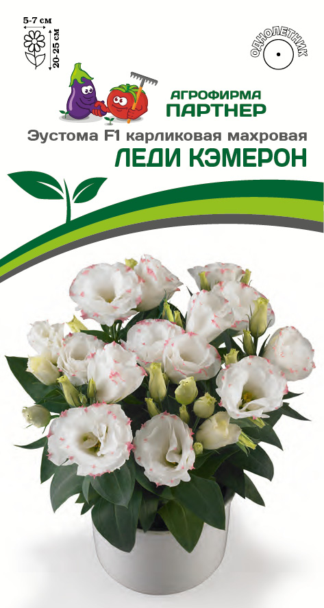 Лучшая контейнерная новинка для дома и сада! Чрезвычайно декоративную ЛЕДИ КЭМЕРОН отличает компактность, прочность стеблей и исключительная выравненность растений. Отличное кущение позволяет закладывать большое количество бутонов, образуя невероятную шапку из цветков. Это миниатюрное растение формирует цветоносы практически из розетки листьев. Несоизмеримо крупные, густомахровые, ширококолокольчатые цветки до 7 см в диаметре расположены по несколько штук на верхушках стеблей и в пазухах листьев. Эустома отлично проявляет себя в садовых композициях: рокариях, альпинариях и цветниках.