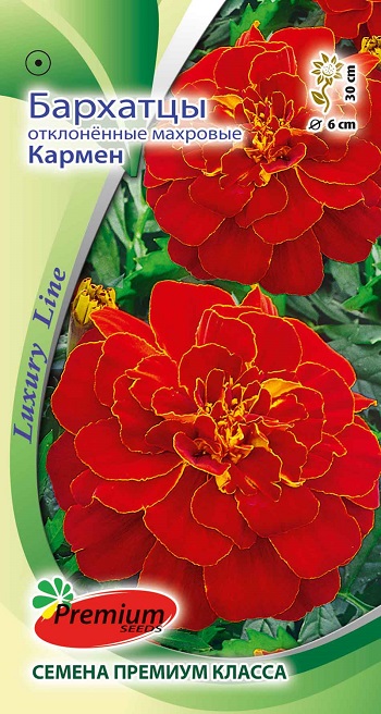 Однолетний, декоративный сорт высотой до 30 см. Растения сильно ветвятся и дают многочисленные боковые побеги. Соцветия махровые, плотные, диаметром 5-6 см. Цветение продолжительное, с начала лета и до самой осени. Используются в цветниках, группами на газонах, для украшения балконов и окон. Благодаря компактной форме растений, наилучшим образом подходят для выращивания в контейнерах и горшках. Обладают тонким и приятным ароматом.